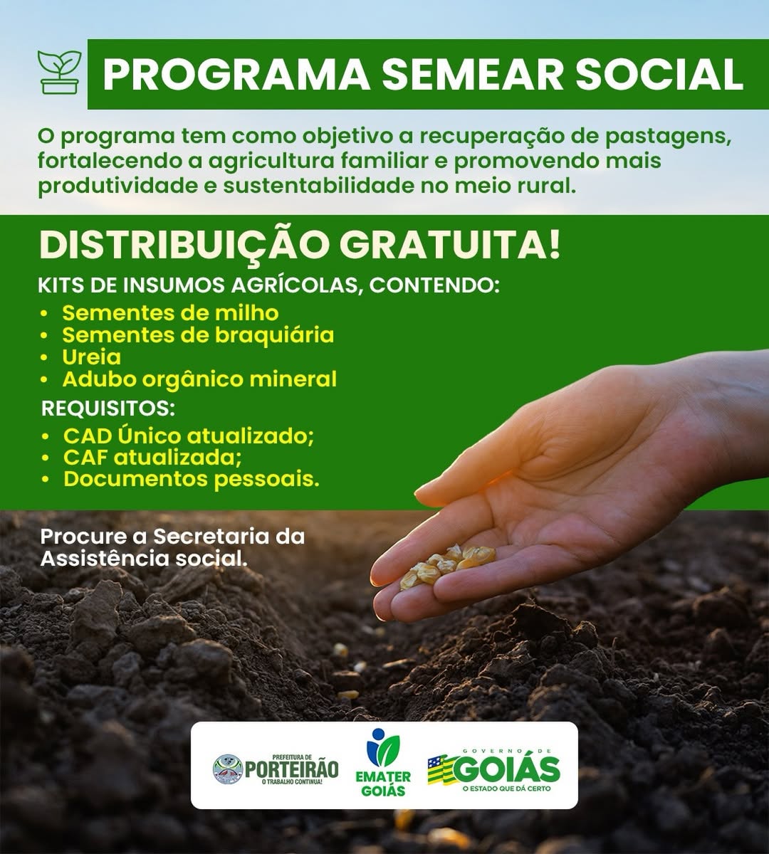 Prefeitura de PORTEIRÃO , em parceria com a Secretaria da Assistência Social e a EMATER Goiás, realiza a distribuição gratuita de kits de insumos agrícolas para fortalecer a agricultura familiar, recuperar pastagens e promover mais produtividade e sustentabilidade no meio rural. 🌱🚜