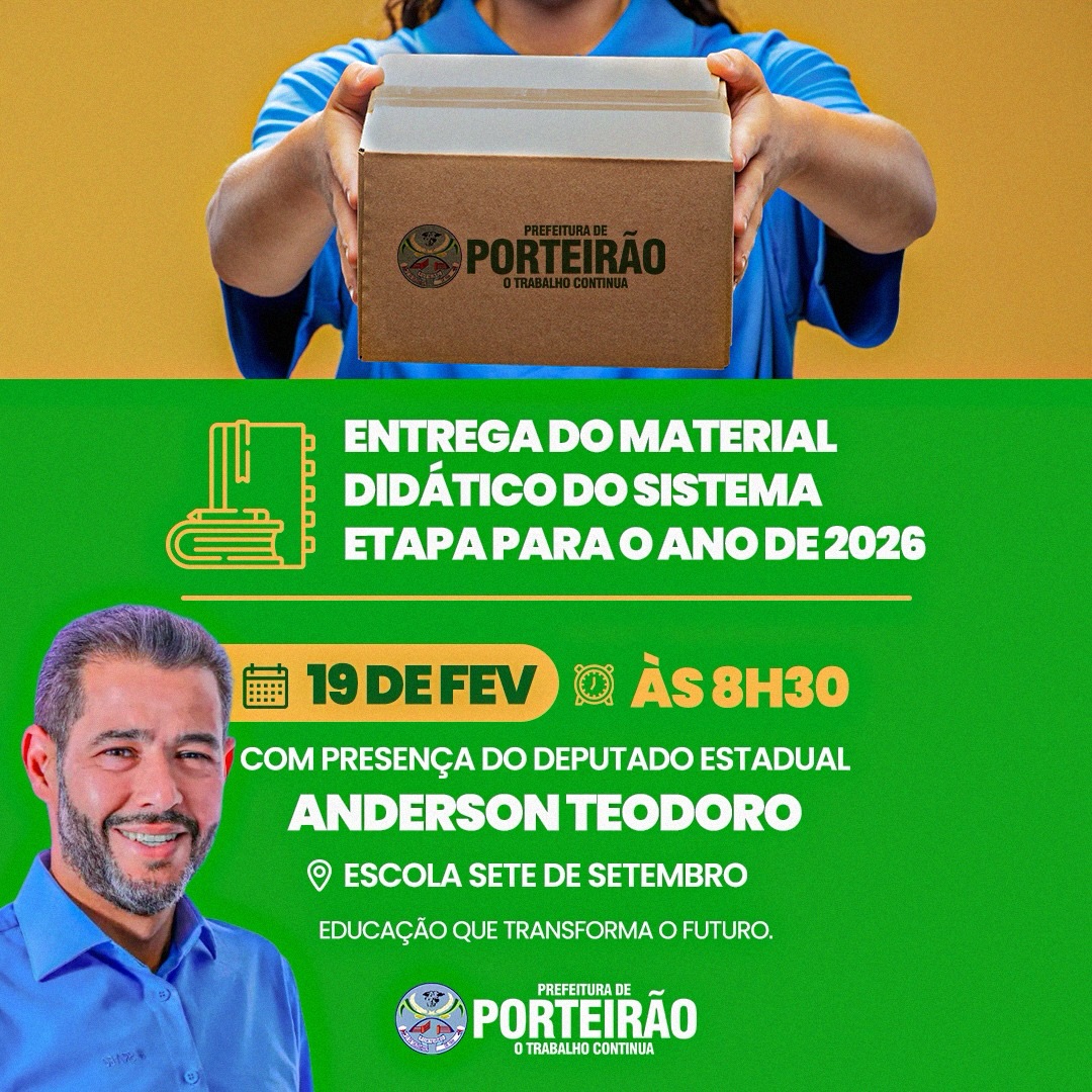 A Prefeitura de Porteirão realiza a entrega do material didático do Sistema Etapa para o ano letivo de 2026, reforçando o compromisso com um ensino de qualidade e mais oportunidades para nossos alunos.