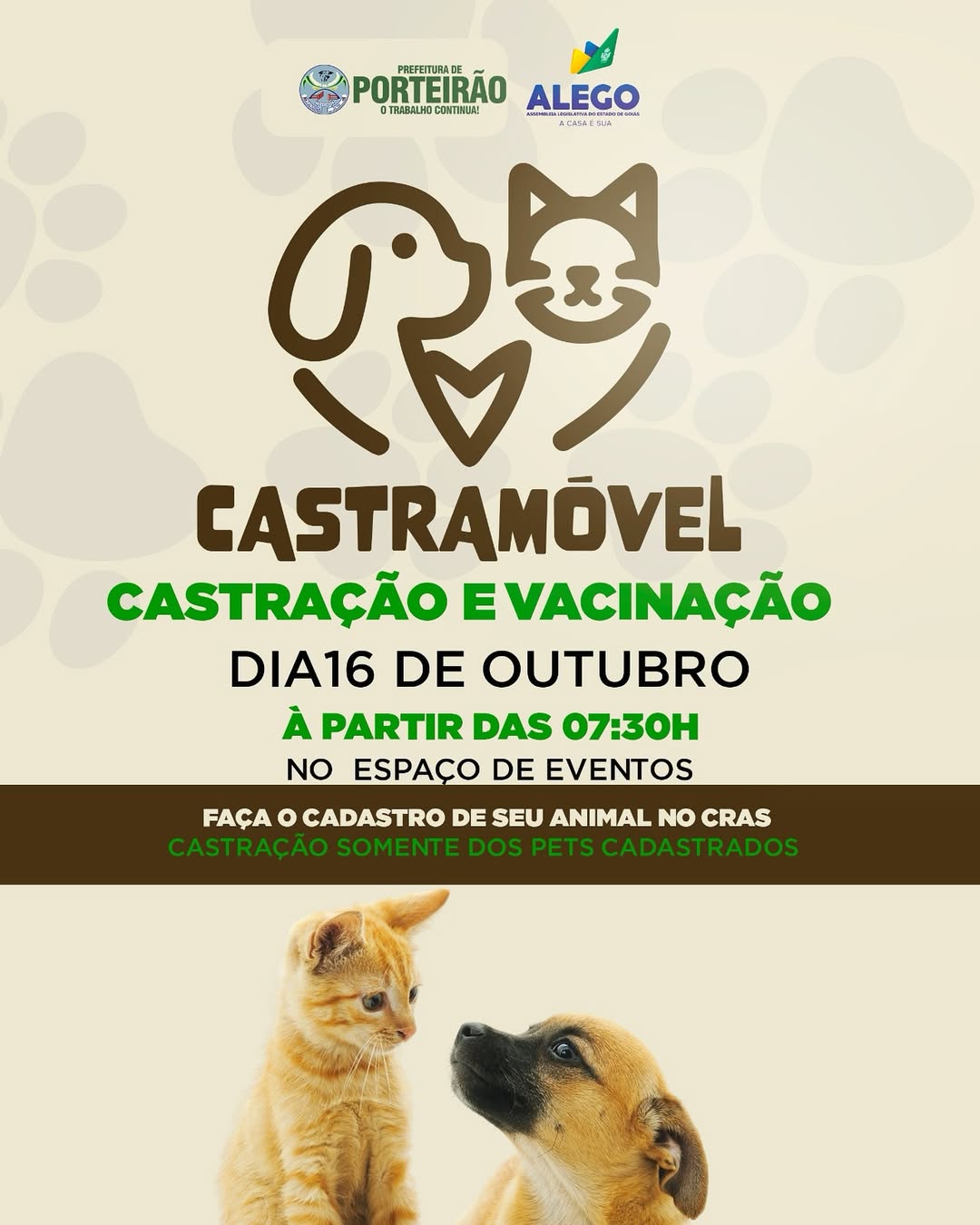 Vem aí a Castração Social, realizada pela Prefeitura Municipal de Porteirão em parceria com a Alego! 🐶🐱
