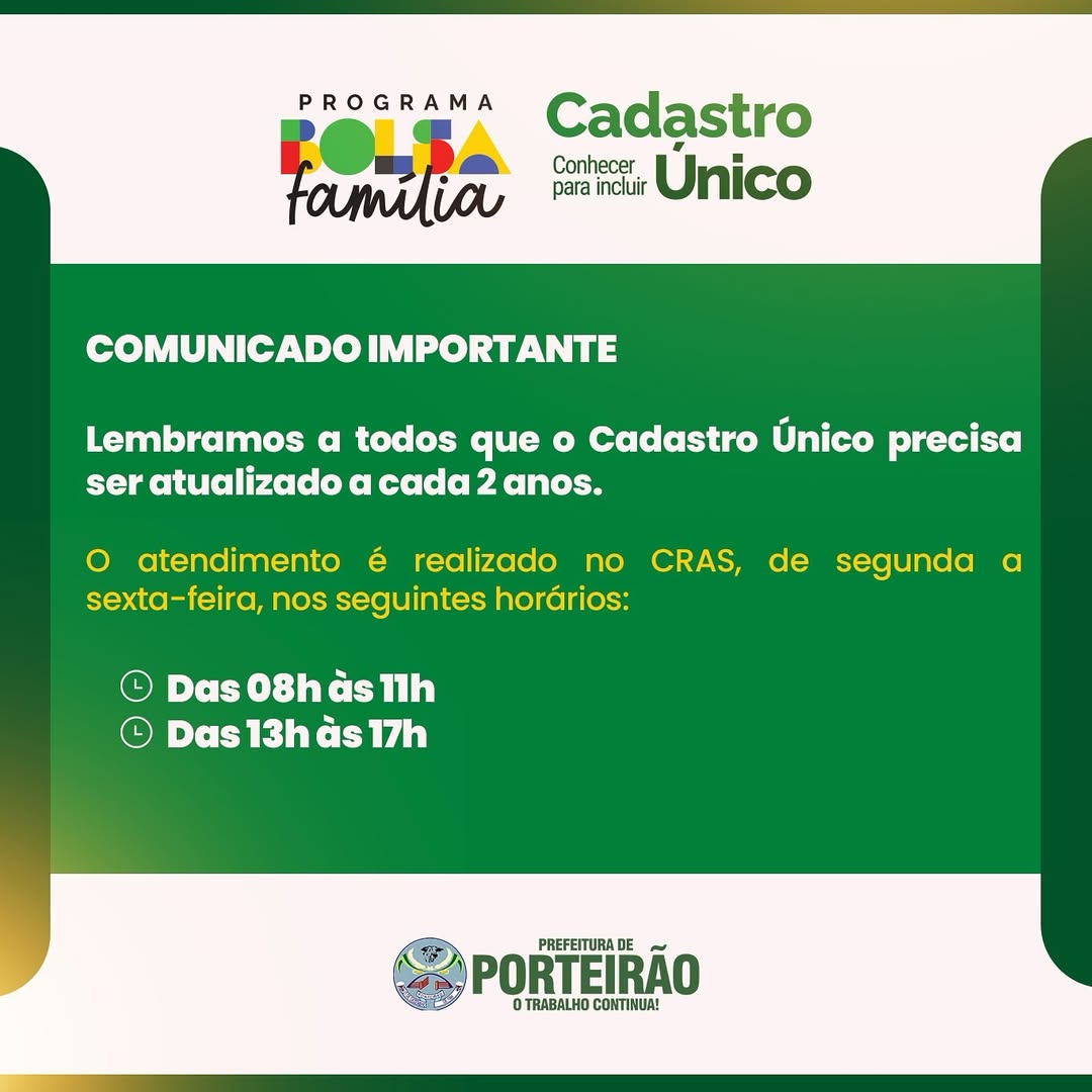 Lembramos que o Cadastro Único precisa ser atualizado a cada 2 anos para garantir o acesso aos benefícios sociais.