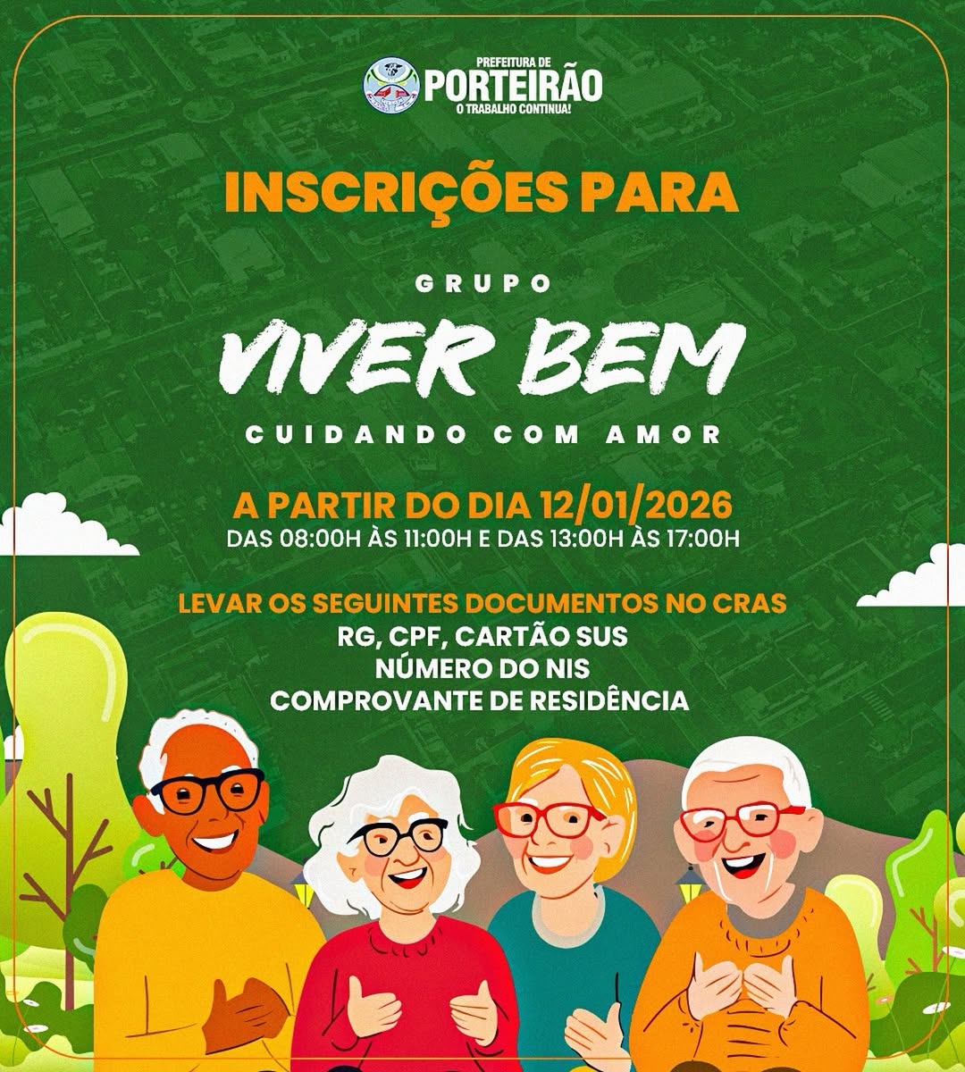 O Grupo Viver Bem – Cuidando com Amor está com inscrições abertas a partir do dia 12/01/2026, no CRAS.🕗 Das 8h às 11h e das 13h às 17h. 👉 Participe e viva mais saúde, convivência e bem-estar! 💚
