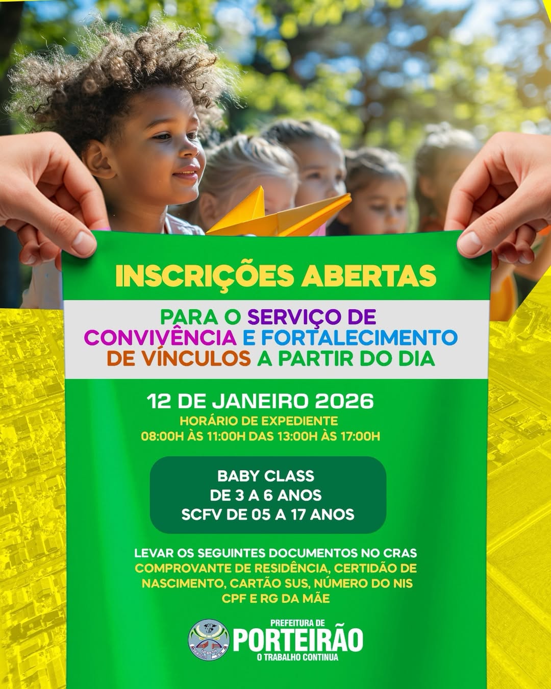 A Prefeitura de Porteirão, por meio da Assistência Social, informa que estão abertas as inscrições para o Serviço de Convivência e Fortalecimento de Vínculos (SCFV) a partir do dia 12 de janeiro de 2026.