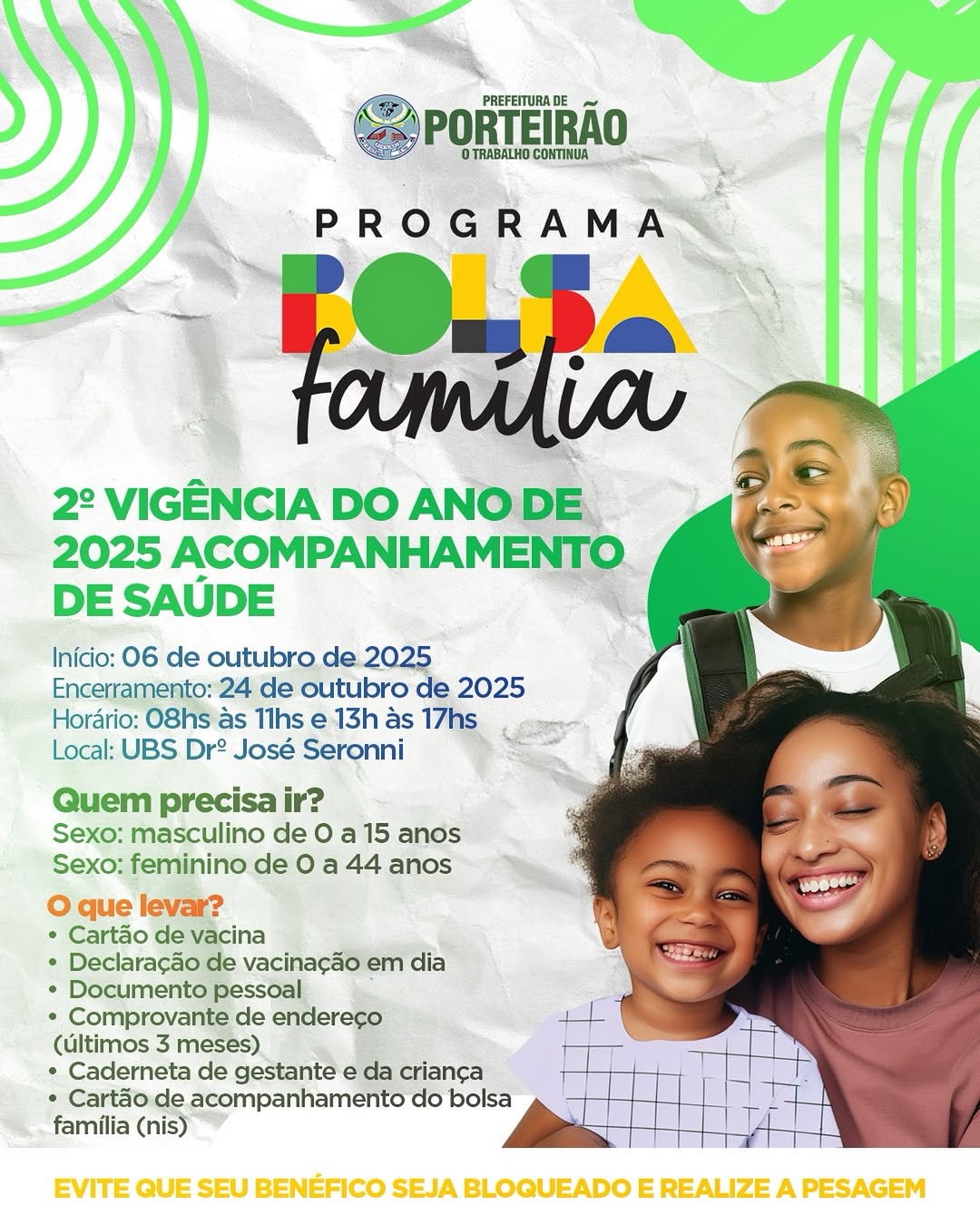 🗓️ De 06 a 24 de outubro de 2025 acontece o acompanhamento de saúde da 2ª vigência do programa.
