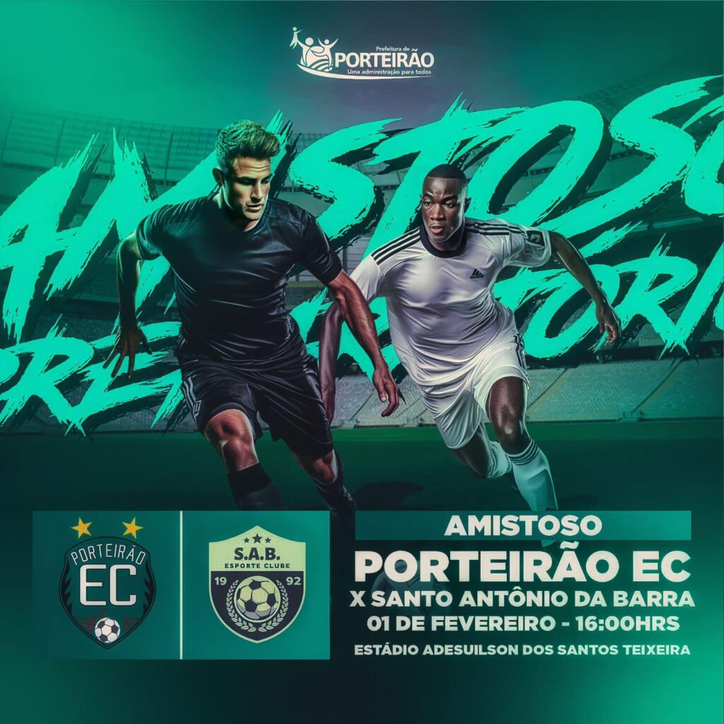 PORTEIRÃO EC X SANTO ANTÔNIO DA BARRA AMANHÃ – 01 DE FEVEREIRO 16:00HRS LOCAL: ESTÁDIO ADESUILSON DOS SANTOS TEIXEIRA. PREFEITURA DE PORTEIRÃO. UMA ADMINISTRAÇÃO PARA TODOS! 1/1