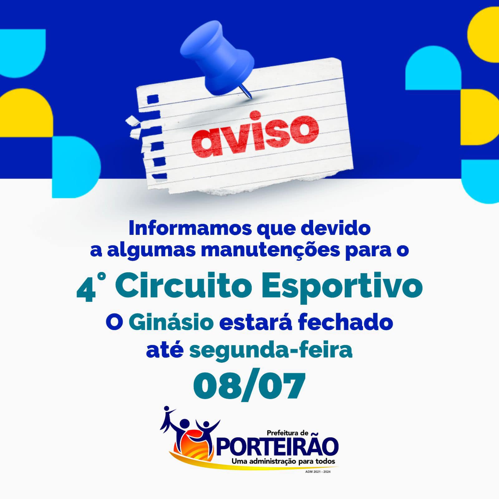 Informamos que devido algumas manutenções para o 4º Circuito Esportivo o Ginásio estará fechado até 08/07 (segunda-feira). Prefeitura de Porteirão. Uma administração para todos!
