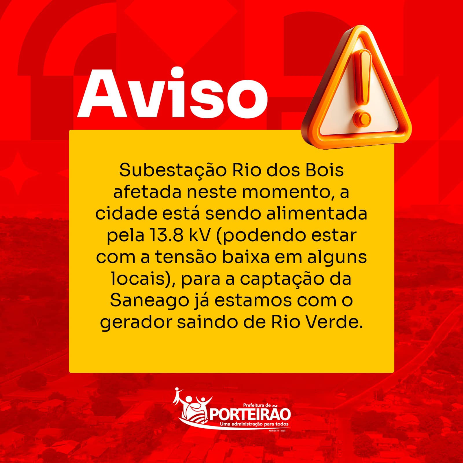 Subestação Rio dos Bois afetada neste momento, a cidade está sendo alimentada pela 13.8 kV (podendo estar com a tensão baixa em alguns locais), para a captação da Saneago já estamos com o gerador saindo de Rio Verde.