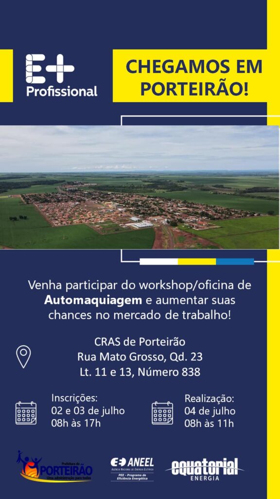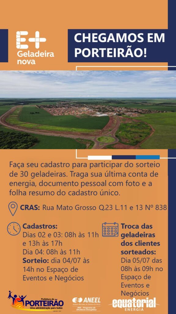 Os cadastros para o sorteio das geladeiras e curso/workshop, troca de lâmpadas será realizado no CRAS – Rua Mato Grosso Q.23 L.11 e 13 Nº 838.