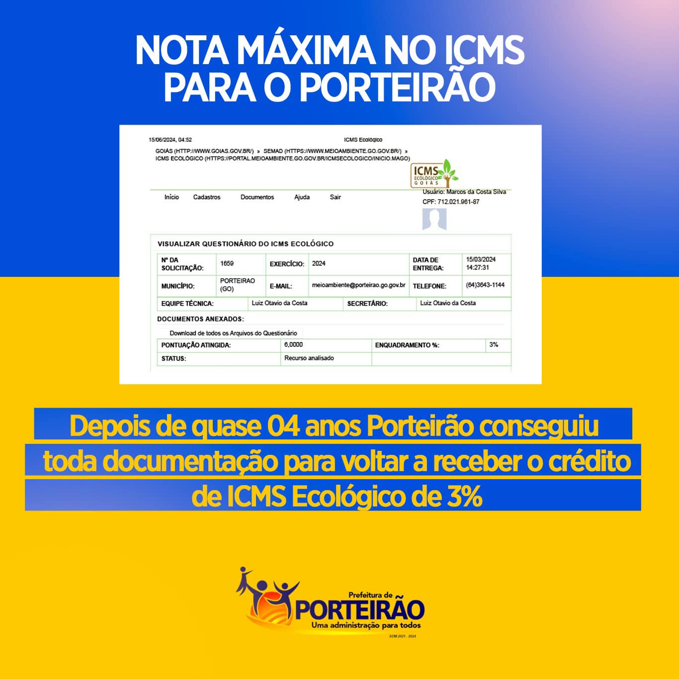Depois de quase 04 anos Porteirão conseguiu toda documentação para voltar a receber o crédito de ICMS Ecológico de 3%. Prefeitura de Porteirão. Uma administração para todos!